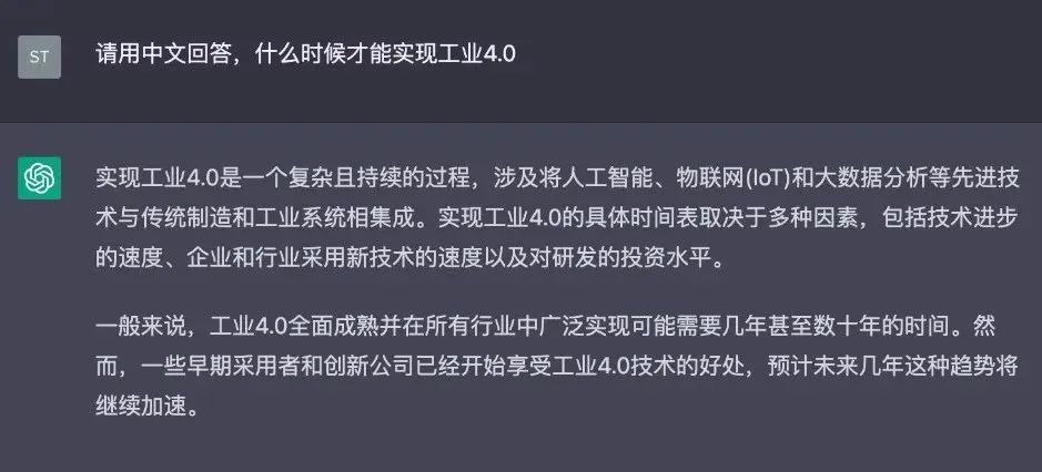 工业互联网是助力制造业高质量发展的重要抓手,也是应对工业发展挑战、推动转型升级的重要战略的关键引擎。我们什么时候能够实现工业互联网、工业4.0?ChatGPT给出答案确实符合现阶段工业互联网的发展现状。