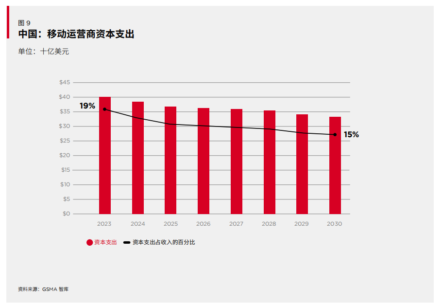 这份报告指出,过去几年间大规模的5G网络建设使中国的资本支出强度达到了创纪录的水平,随着运营商将重点转向创造投资回报,未来几年整体资本支出将开始下降。2023-2030年期间,中国运营商将对自身网络投入2910亿美元,其中大部分用于5G。